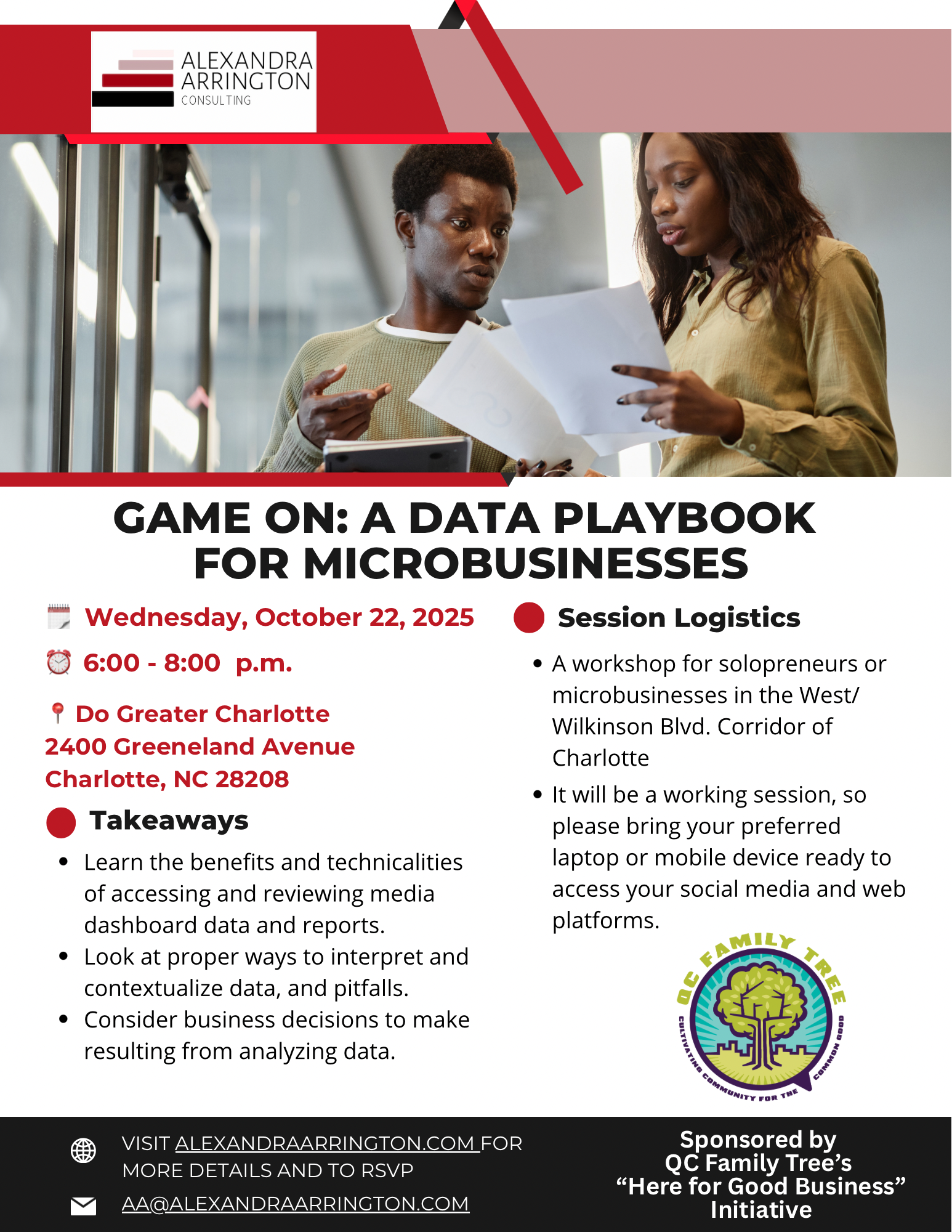 Join Alexandra Arrington Consulting for a free hands on workshop geared toward solopreneurs and microbusinesses in West Corridor for a primer on understanding and using data analytics to make informed business decisions. Good information supports good decision-making, which impacts the pace at which you can meet your business goals and the quality of your and your clients’ experiences. Sponsored by QC Family Tree’s Here for Good Business Initiative. RSVP by October 20th via the below form for more details and instructions. Dinner will be served!